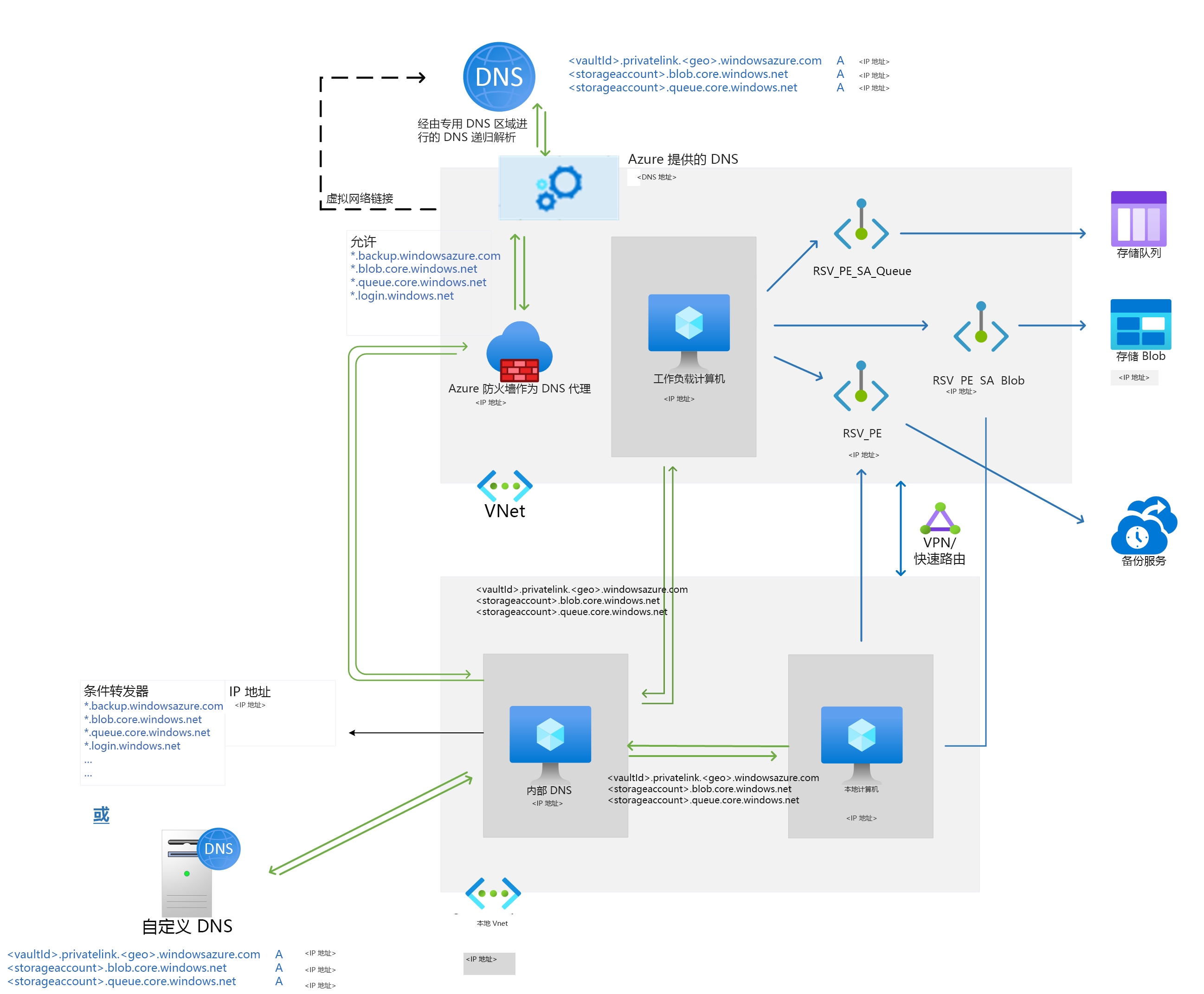 对于具有专用终结点设置的恢复服务保管库,FQDN(privatelink.<geo>.backup.windowsazure.com、*.blob.core.windows.net、*.queue.core.windows.net、*.blob.storage.azure.net)的名称解析应返回专用 IP 地址。 可以使用以下内容来实现这一点: