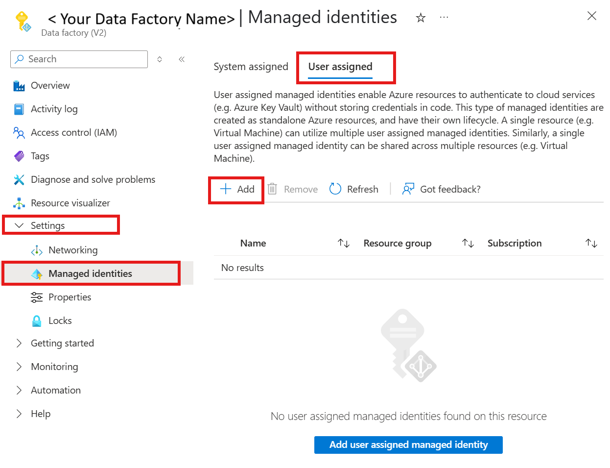 1. 数据工厂或 Synapse 工作区可与系统分配的托管标识相关联。 了解详细信息, 生成系统分配的托管标识
