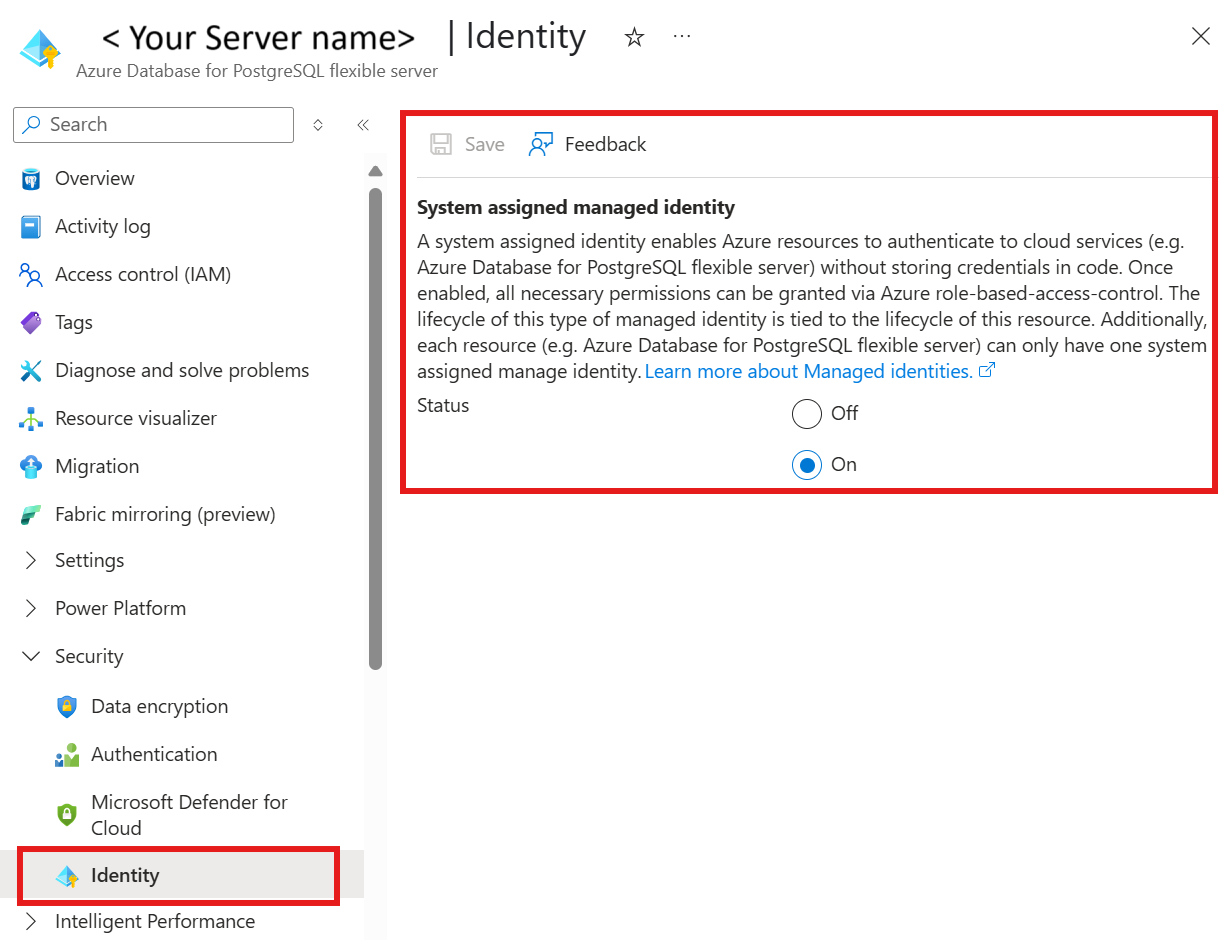 2. 为 Azure Database for PostgreSQL 将系统分配的托管标识设为“开”。