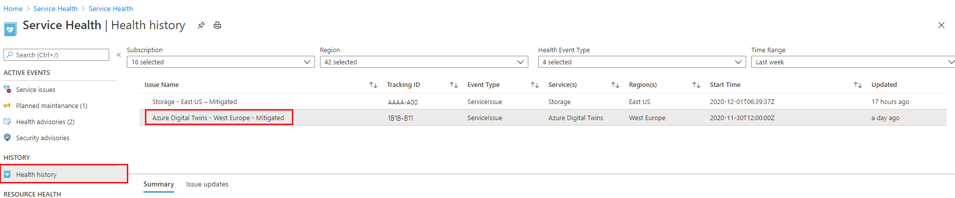 此工具中显示的信息不特定于一个 Azure 数字孪生实例。 使用服务运行状况了解某个区域或订阅中 Azure 数字孪生服务的运行状况后,可以通过使用 Azure 资源运行状况向下钻取到特定实例并查看这些实例是否受影响,来实施进一步监视。