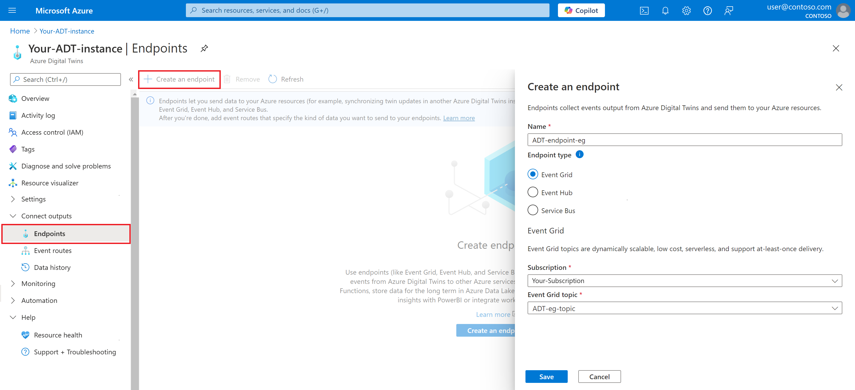 创建终结点资源后,可以创建 Azure 数字孪生终结点。 使用以下选项卡选择首选体验。