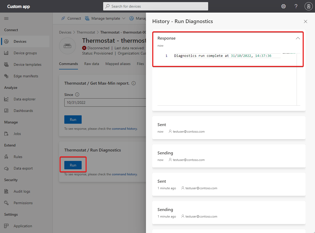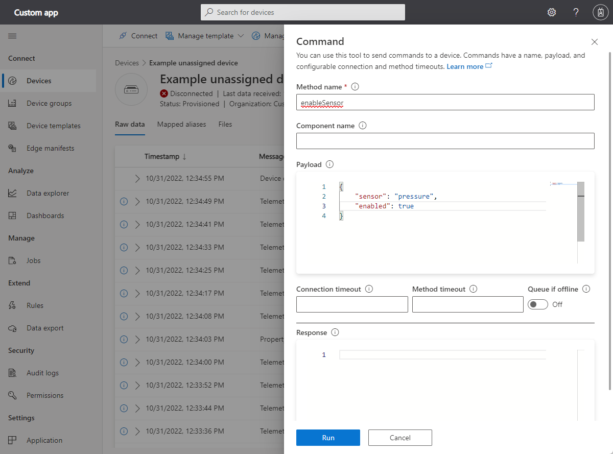操作员可以使用 IoT Central UI 在设备上调用命令。 命令控制设备的行为。 例如,操作员可以调用命令来重新启动设备或收集诊断数据。
