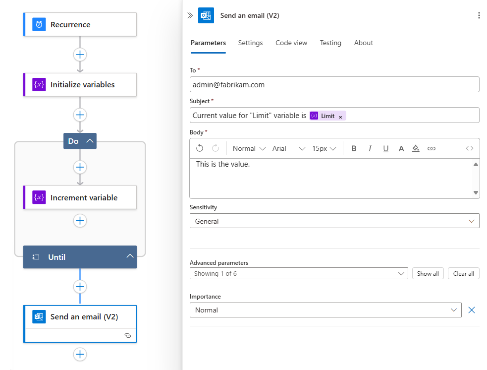 参数 值 限制 选择“Limit”变量。 值 1 在“Until”操作外部和下方,按照以下常规步骤在“消耗”或“标准”逻辑应用工作流中添加发送电子邮件的操作。