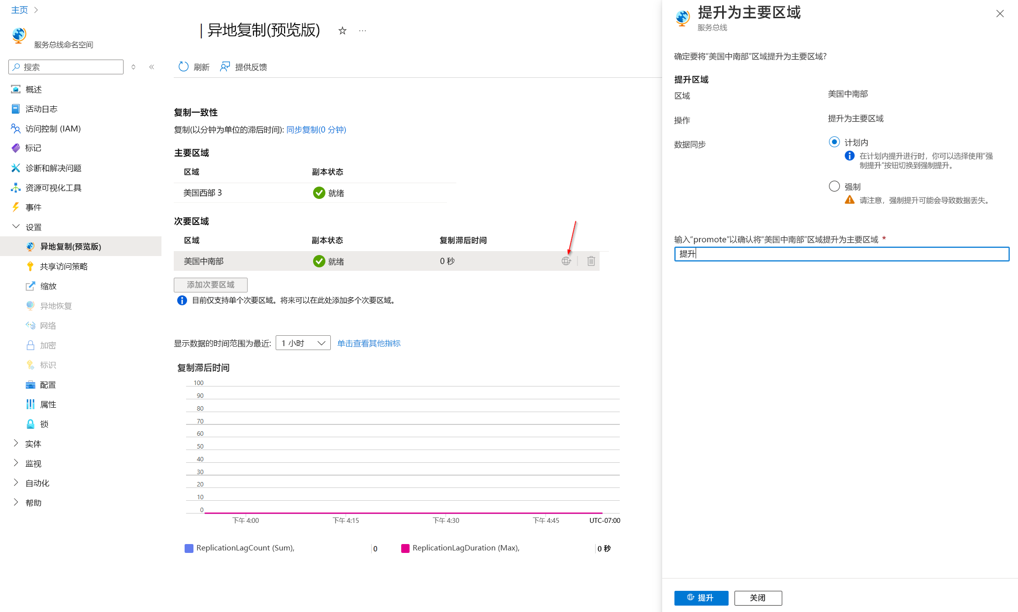提升由客户手动触发(通过命令显式触发,或者通过客户拥有的触发了该命令的业务逻辑),从不会由 Azure 触发。 这为客户提供了对 Azure 主干的中断解决方法的完整所有权和可见性。 选择计划的提升时,服务会等待赶上复制滞后时间后再启动提升。 另一方面,当选择强制升级时,服务会立即启动此升级。 从请求提升时开始到提升完成为止,命名空间处于只读模式。 在计划晋升启动后,可以随时进行强制晋升。 这样,当计划的故障转移时间超出预期时,用户就可以控制加快提升。