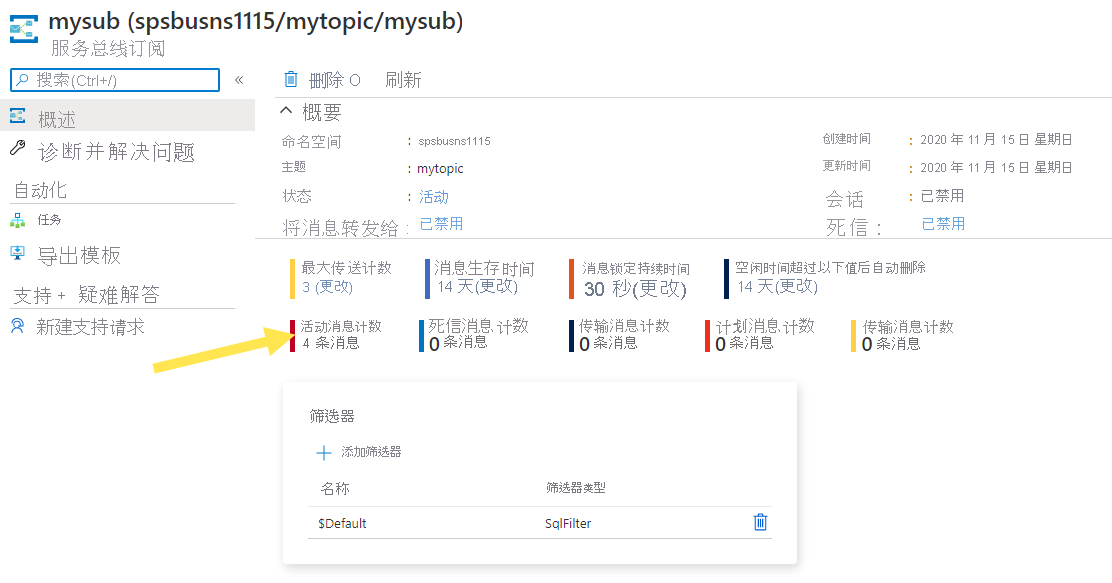 在此页上,如果选择一个订阅,则将转到“服务总线订阅”页。 可以在此页上查看活动消息计数、死信消息计数等。 在此示例中,还有四条活动消息未被接收器接收。