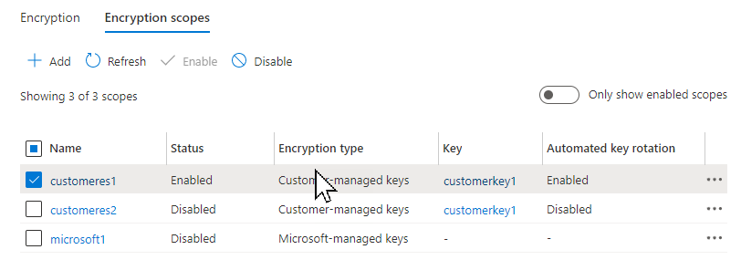 - 导航到“ 加密范围 ”选项卡,查看存储帐户的加密范围列表。