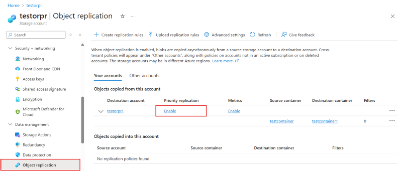 # Set OR policy on destination account with priority replication enabled