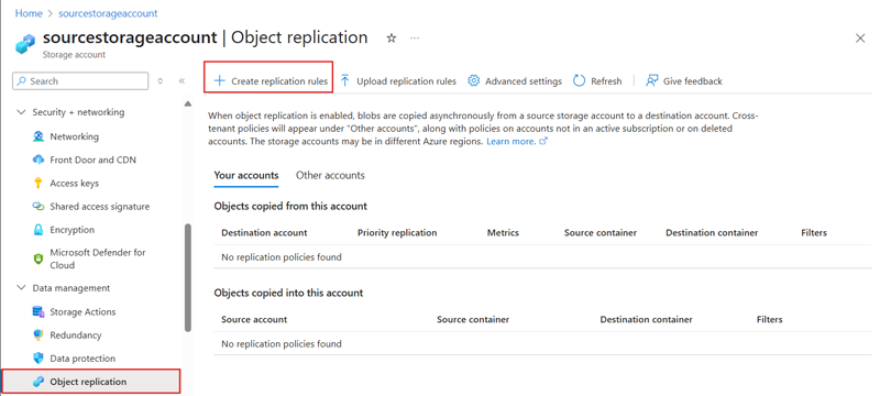 在 Azure 门户中,导航到要修改的存储帐户。 在左侧导航窗格中,展开 “数据管理 ”组,然后选择“ 对象复制”。 默认情况下,“ 帐户 ”选项卡处于选中状态,显示存储帐户的所有现有 OR 策略。