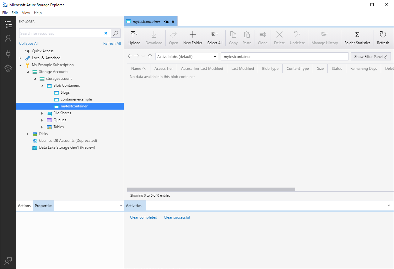 在 Azure 存储资源管理器应用程序的存储帐户下选择一个容器。 主窗格会显示一个列表,包含所选容器中的 Blob。