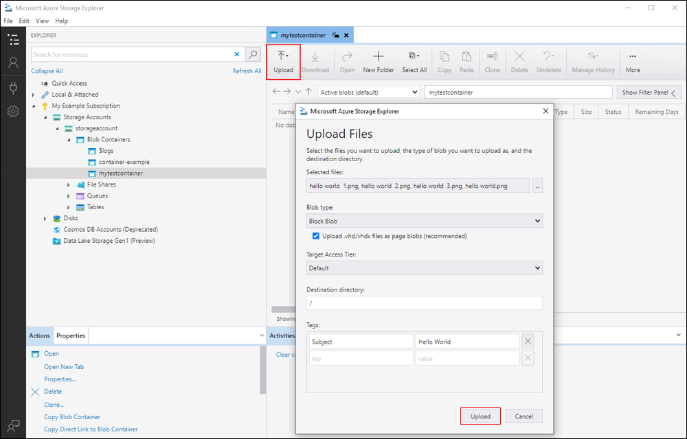 选择要上传的文件或文件夹。 选择“Blob 类型” 。 可以接受的选项是“追加”、“页”或“块”Blob。