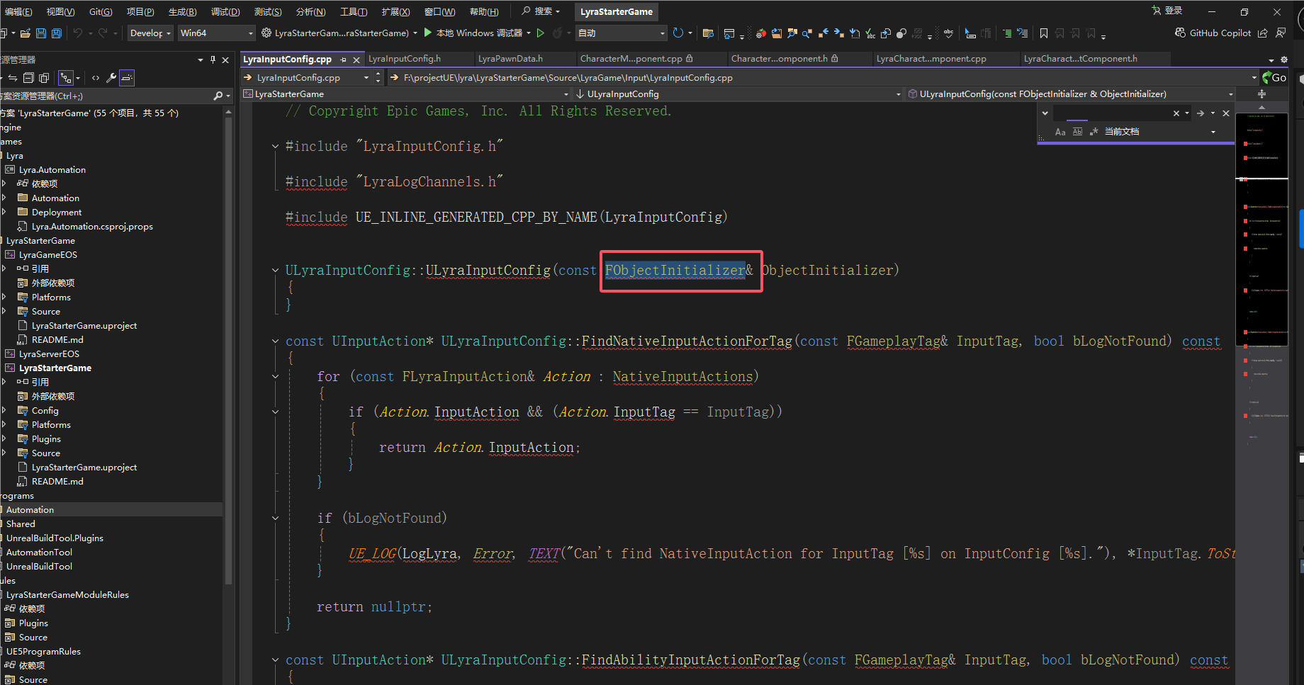 如图所示, VS2017 的时候,我双击选择图中的字符串 FObjectInitializer, 再按键盘 ctrl+f , 右侧弹出的搜索栏,会自动把我选择的 FObjectInitializer 字符串,添加进搜索内容。