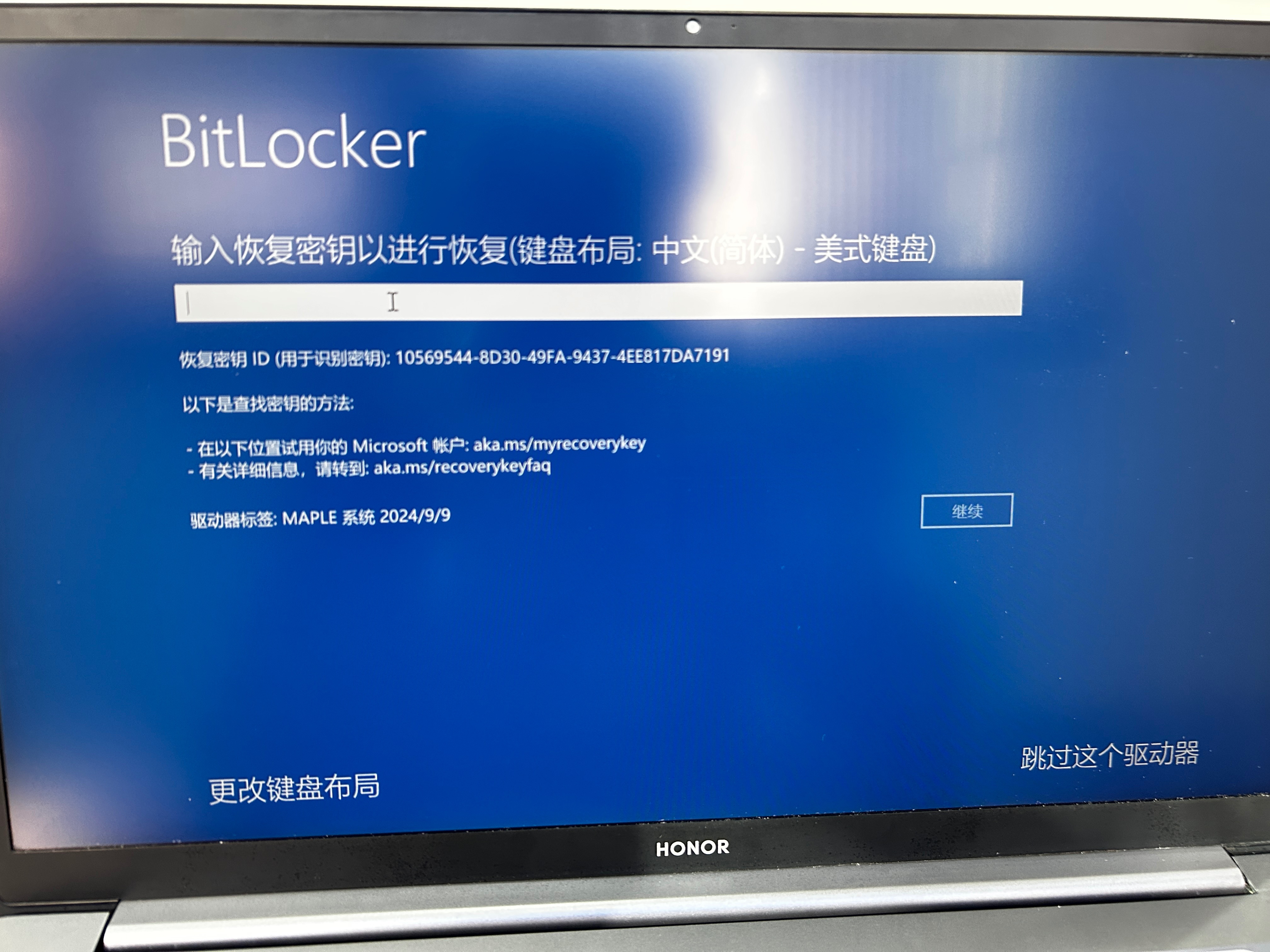 **重要:**Microsoft支持部门无法提供或重新创建丢失的 BitLocker 恢复密钥。