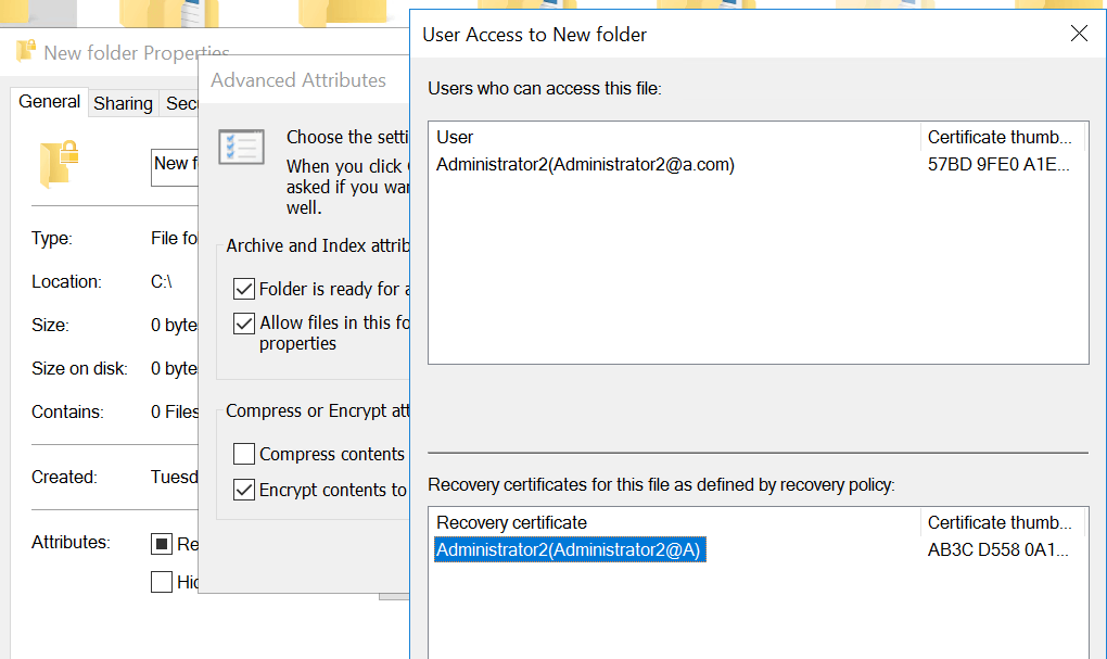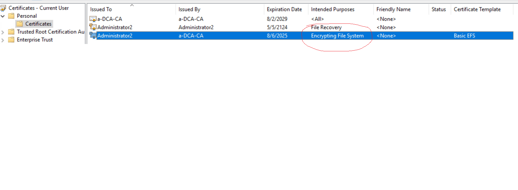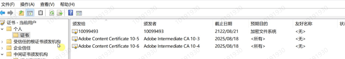 问题就出在这里,您圈出来的就是中文名10099493@域名这个账户,而这台电脑以前用的都是10099493@域名的证书指纹, 被加密的文件也是10099493@域名这个账户进行的加密,我们也不知道为什么会出现这个证书,并且文件都是通过这个证书加密的。
