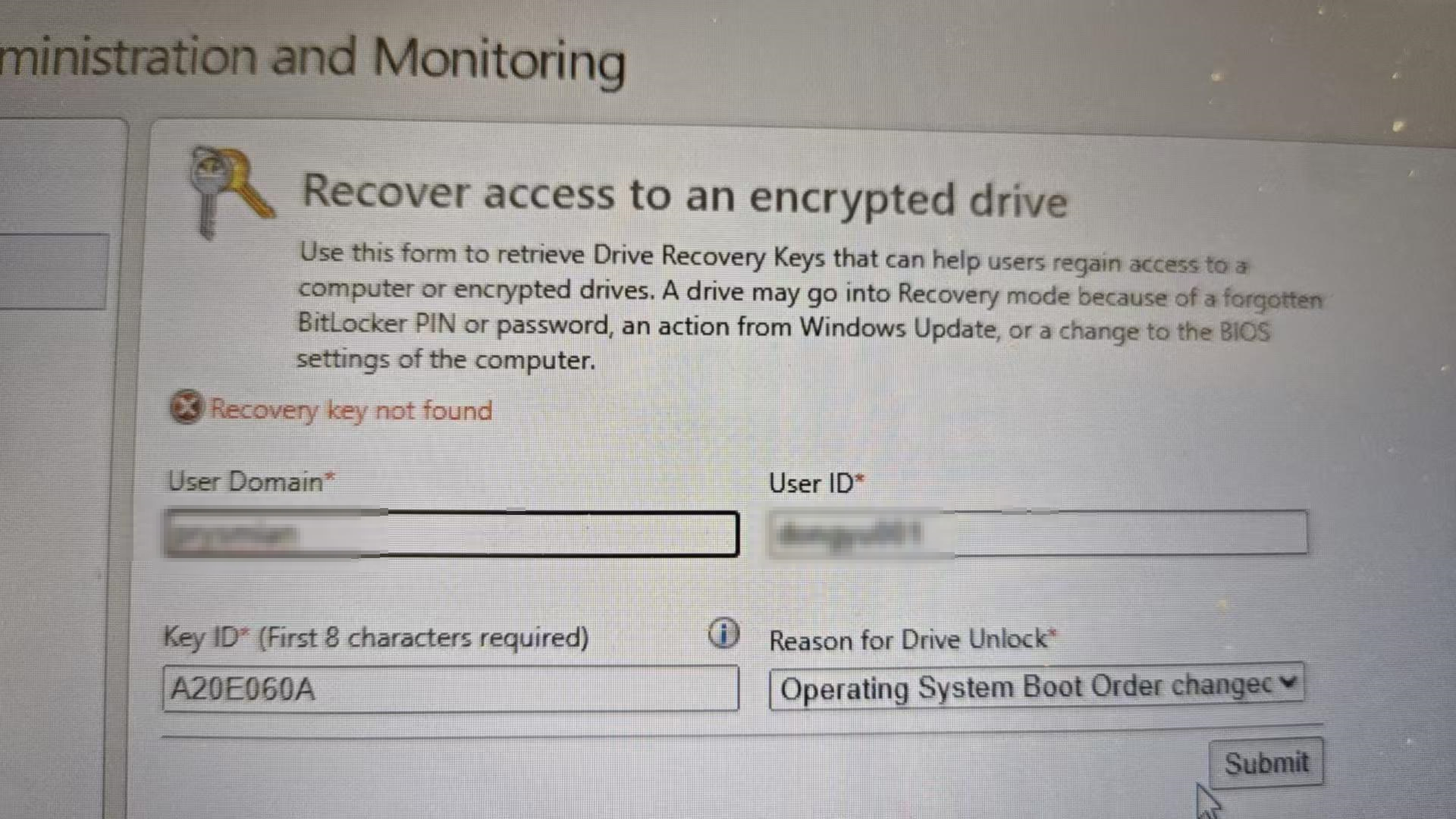 如图所示,在更换主板后,原BitLocker密码提示错误,在生成Recovery key时提示Recovery Key not found/Invalid Key ID,无论我是使用前八位的Recovery Key ID还是完整的Recovery Key ID,这导致了我更换完主板之后无法进入系统,后续是重新替换为旧主板开机进入系统后,将BitLocker 关闭之后,在进行更换主板,之后进入系统之后再重新开启BitLocker,在这个过程中,解密在重新加密的时间占用太久,我认为“原BitLocker密码无效以及无法生成recovery key”的情况不是一个正常的情况,所以存在疑问?