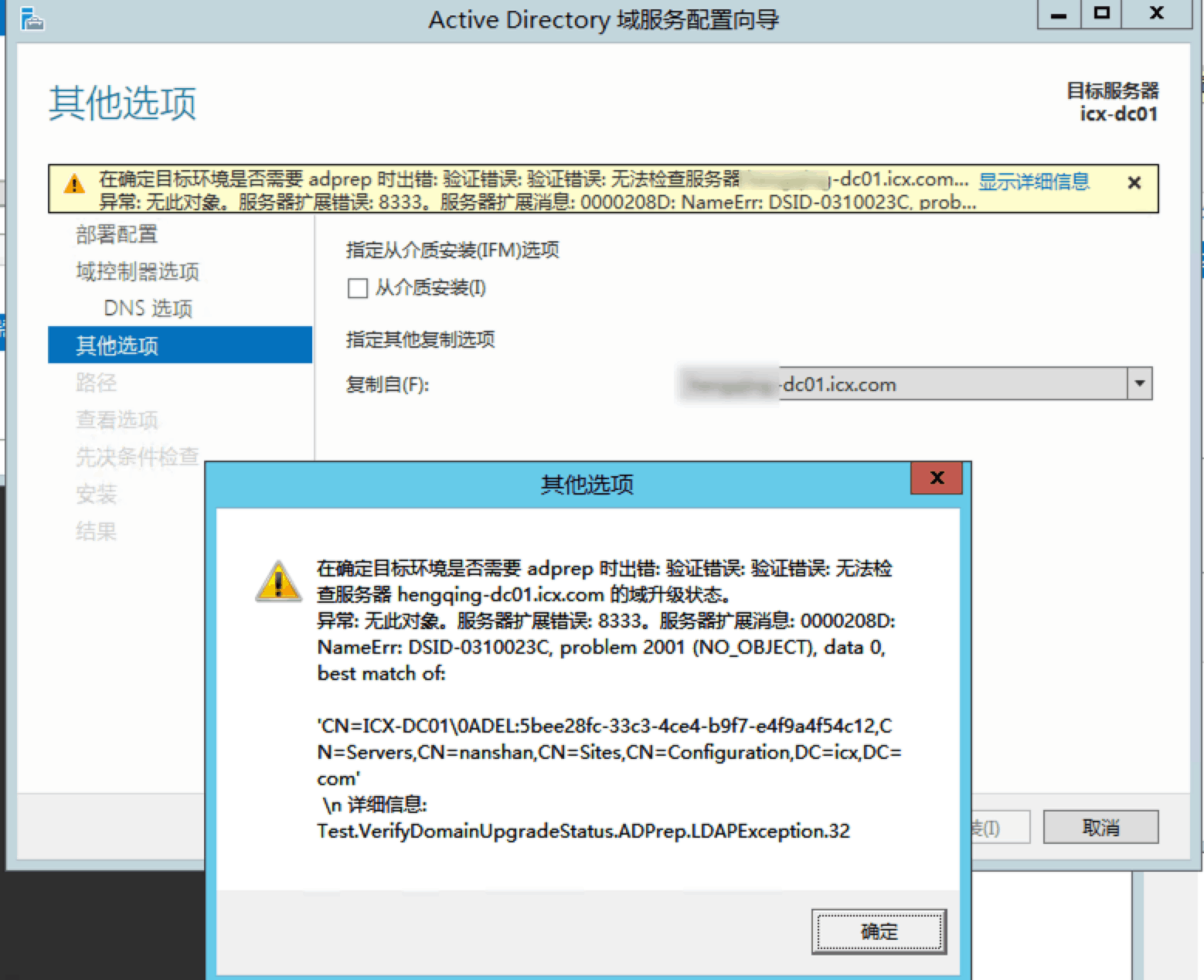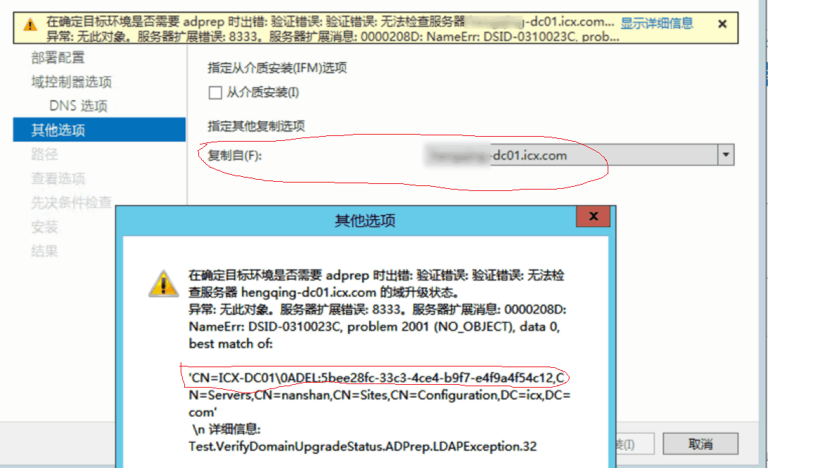 请问您在提升域控,复制自,这里选择的域控是哪个?这个域控是被删除了吗?还是没有删除,但是这个域控存在问题?