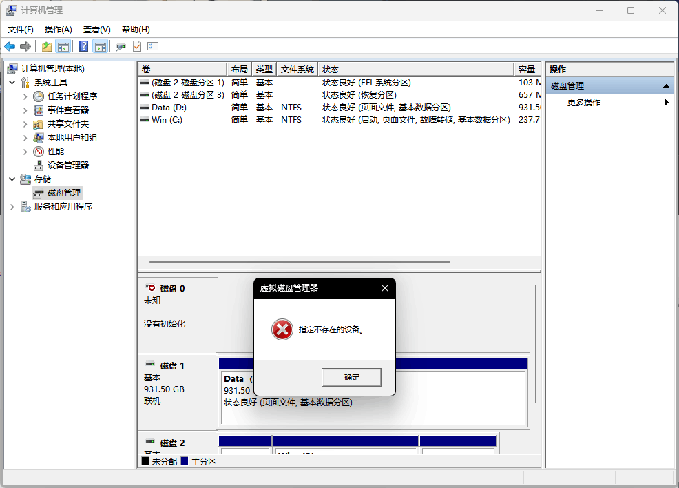 再计算机管理页面 磁盘管理 下方出现一个 磁盘0 未知 没有初始化 初始化之后 提示指定不存的设备 怎么回事啊