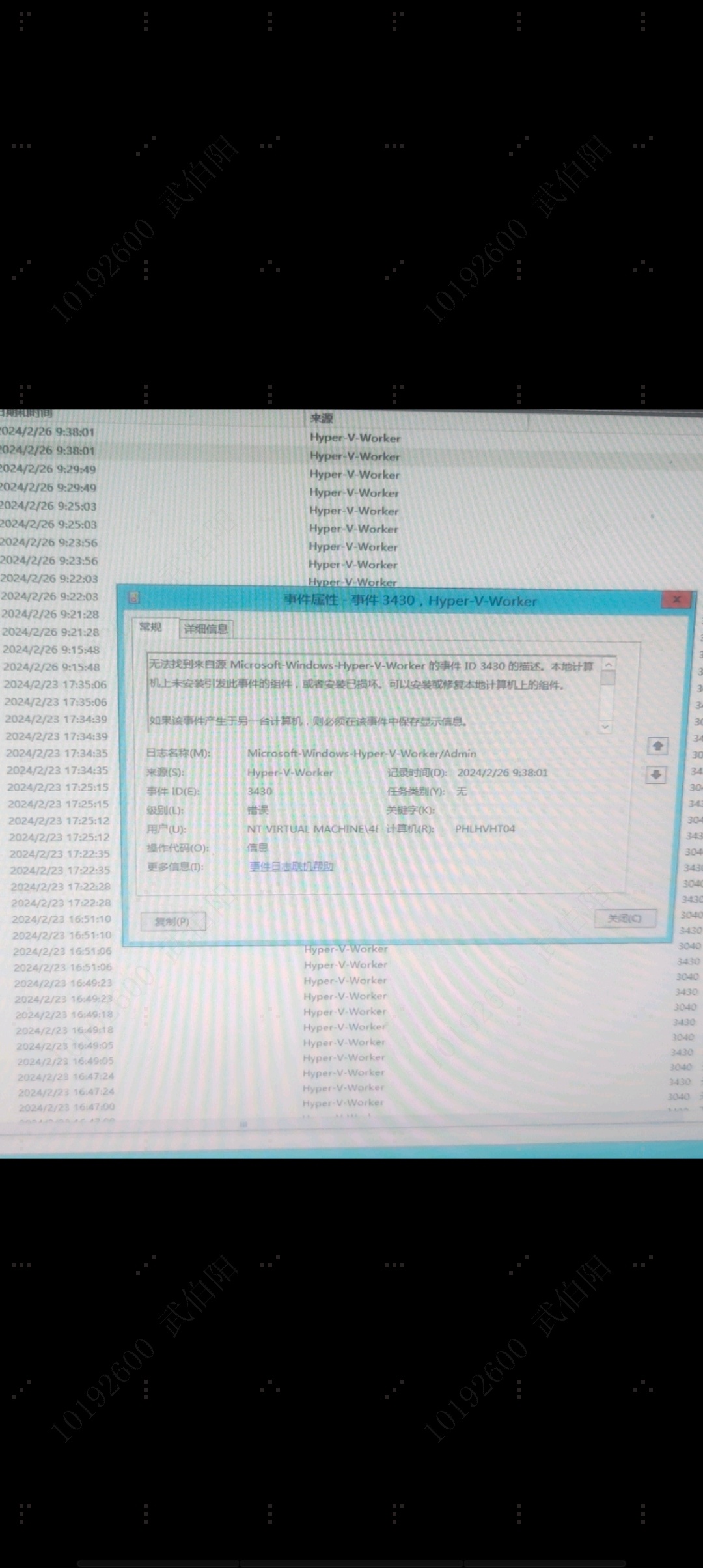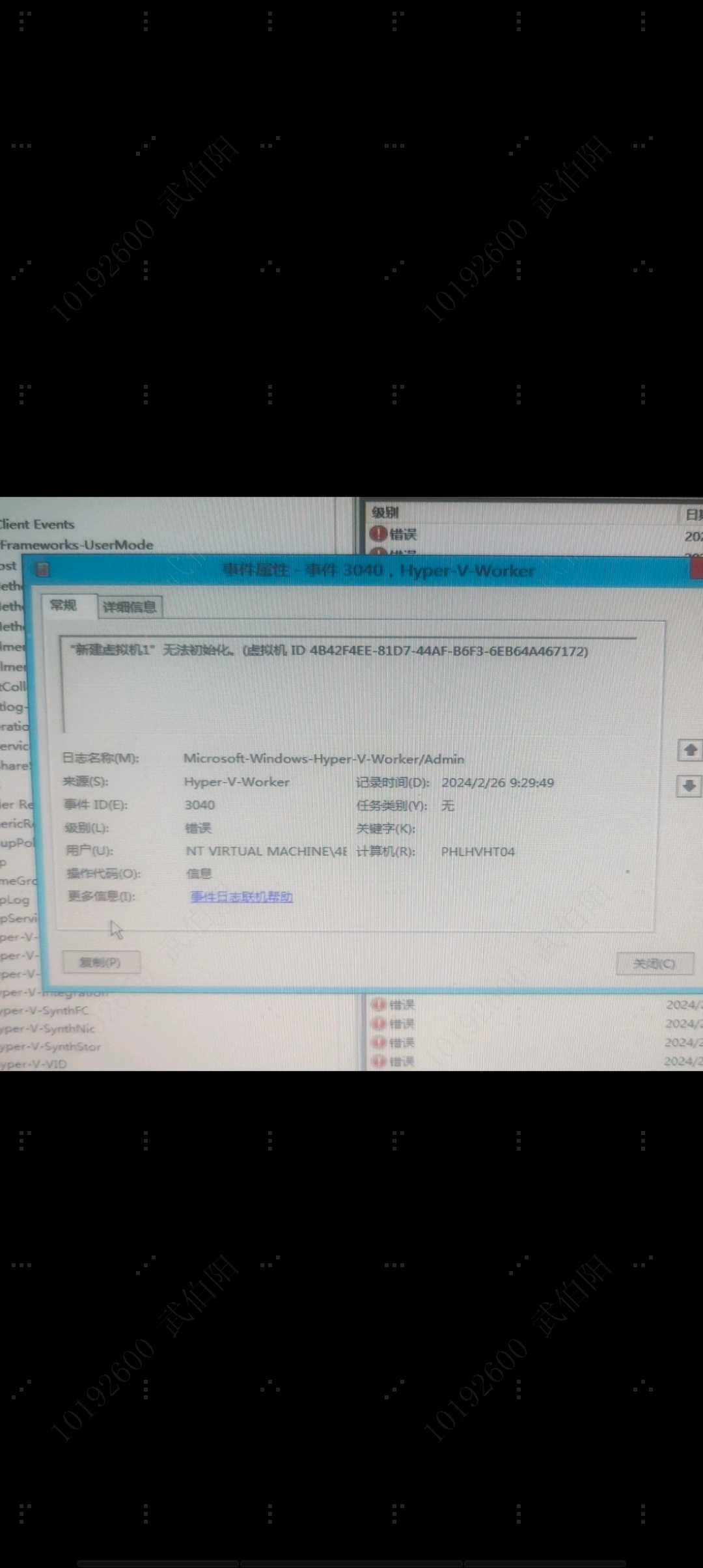 能否麻烦您提供以下具体的报错截图?(Event 3040,3034以及虚拟机启动错误截图)
