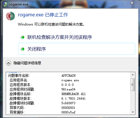 根据您提供的信息,这边确认到您的问题是由于rogame.exe这个可执行文件本身出现错误异常所导致。