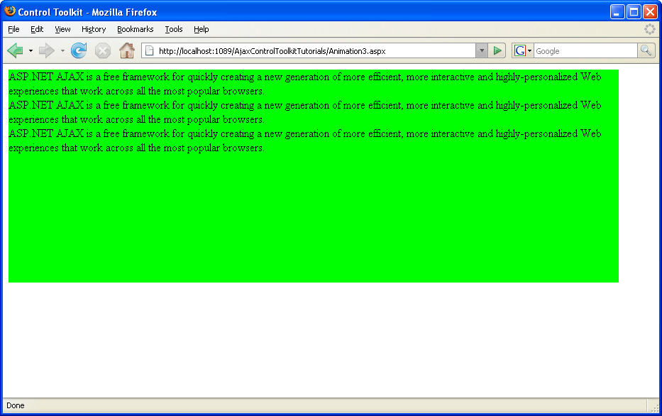 ASP.NET AJAX 控件工具包中的动画控件不仅是一个控件,而且是一个用于向控件添加动画的整个框架。 它允许一个接一个地运行多个动画。