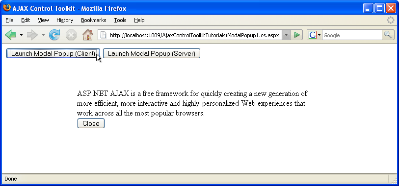 的工作 launchModal() 是显示 ModalPopup。 加载 launchModal() 完整的 HTML 页后,将执行 函数。 但是,此时,ASP.NET AJAX 框架尚未完全加载。 因此, launchModal() 函数只设置一个变量,ModalPopup 控件稍后必须显示该变量: