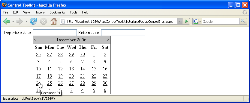 现在,只要单击日历日期,所选日期就会显示在关联的文本框中,从而创建当前可在许多网站上找到的日期选取器控件。