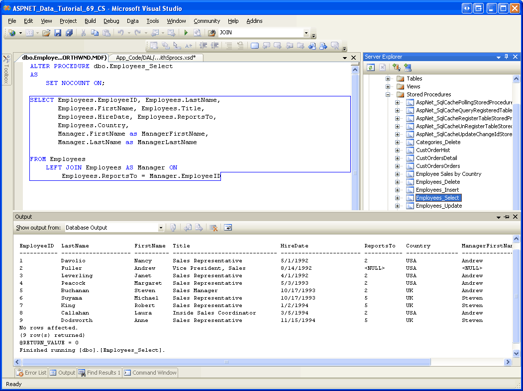 自动创建了插入、更新和删除存储过程,并正确配置了InsertCommand、UpdateCommand和DeleteCommand属性后,我们就可以自定义SelectCommand存储过程,以返回关于每个员工经理的额外信息。 具体而言,我们需要更新Employees_Select存储过程以使用JOIN并返回管理器的FirstName和LastName值。 更新存储过程后,我们需要更新 DataTable,使其包含这些附加列。 我们将在步骤 2 和 3 中处理这两个任务。