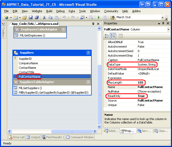 单击“完成”,完成向导。 这会自动向 <FullContactName 检测列是否为计算列,因此是只读的。 因此,它将列 ReadOnly 的属性设置为 true。 若要验证这一点,请从SuppliersDataTable中选择列,然后转到属性窗口(请参阅图 7)。 请注意, FullContactName 列 DataType 和 MaxLength 属性也相应地设置。