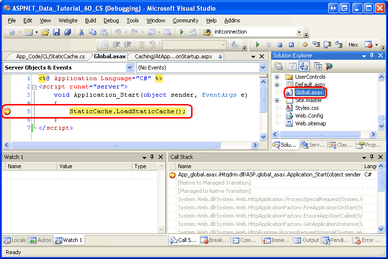 图 4:使用断点验证 Application_Start 事件处理程序是否正在执行(单击以查看全尺寸图像)