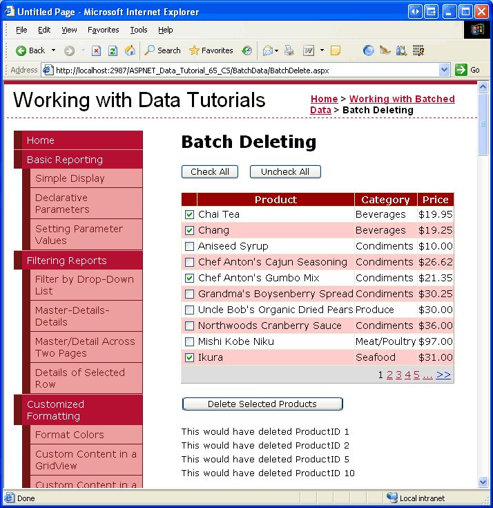 在复制声明性标记和源代码后,请花点时间通过浏览器查看并测试 BatchDelete.aspx。 您应该会看到一个 GridView,其中列出前 10 个产品。每行显示产品名称、类别和价格,并附有一个复选框。 应有三个按钮:“全选”、“取消全选”和“删除所选产品”。 单击“全部选中”按钮将选中所有复选框,“全部取消选中”将清除所有复选框。 单击“删除所选产品”会显示一条消息,其中列出了 ProductID 所选产品的值,但实际上不会删除产品。