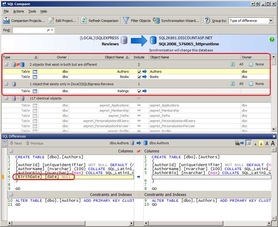 选择数据库对象将显示“SQL 差异”窗口,其中显示了这些对象的差异。 图 2 底部显示的“SQL 差异”窗口突出显示了开发数据库中的 Authors 表具有 BirthDate 列,该列在 Authors 生产数据库的表中找不到。