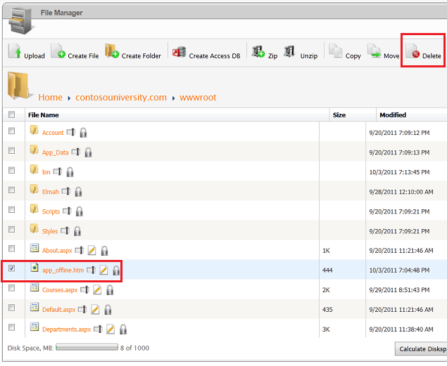 返回到 控制面板中的文件管理器 应用程序。 选择 contosouniversity.com 和 wwwroot,选择 app_offline.htm,然后单击“ 删除”。