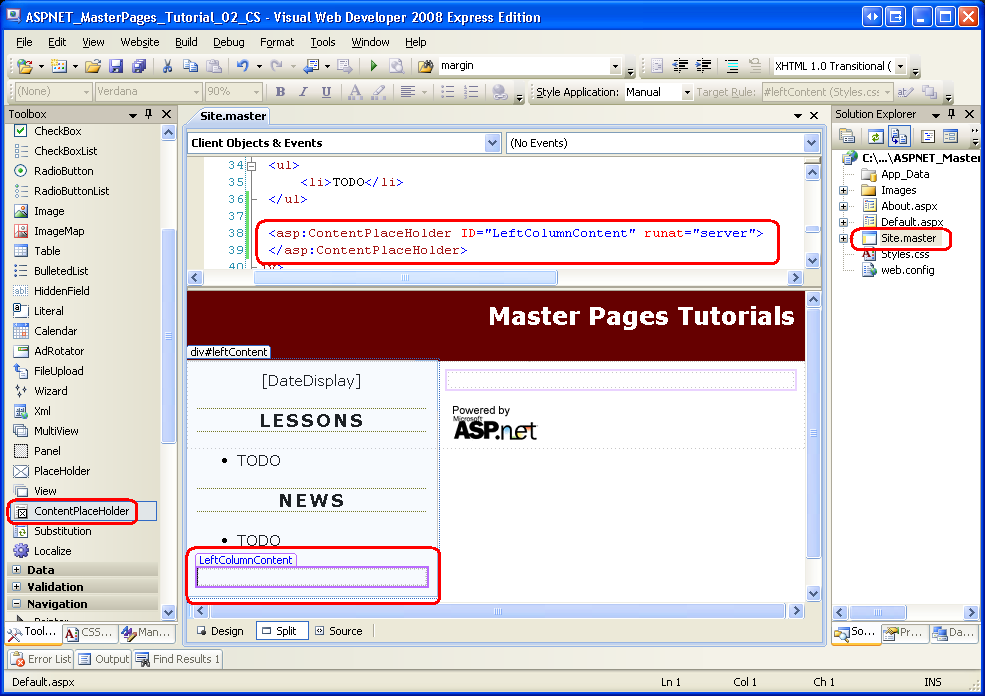 图 02:向母版页的左列添加 ContentPlaceHolder 控件(单击可查看全尺寸图像)
