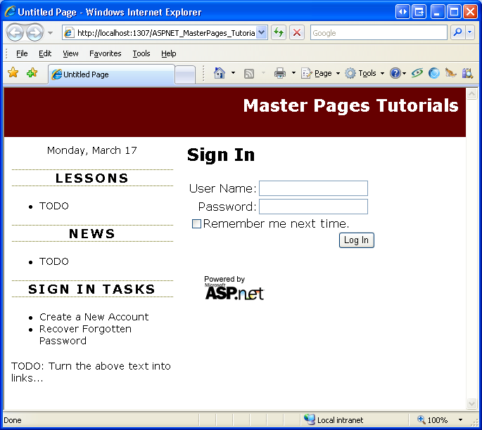 图 7 显示通过浏览器查看此页面。 由于此页面指定 ContentPlaceHolder 的内容控件 QuickLoginUI ,因此它将替代母版页中指定的默认内容。 净效果是母版页的设计视图(见图 6)中显示的登录控件未在此页中呈现。