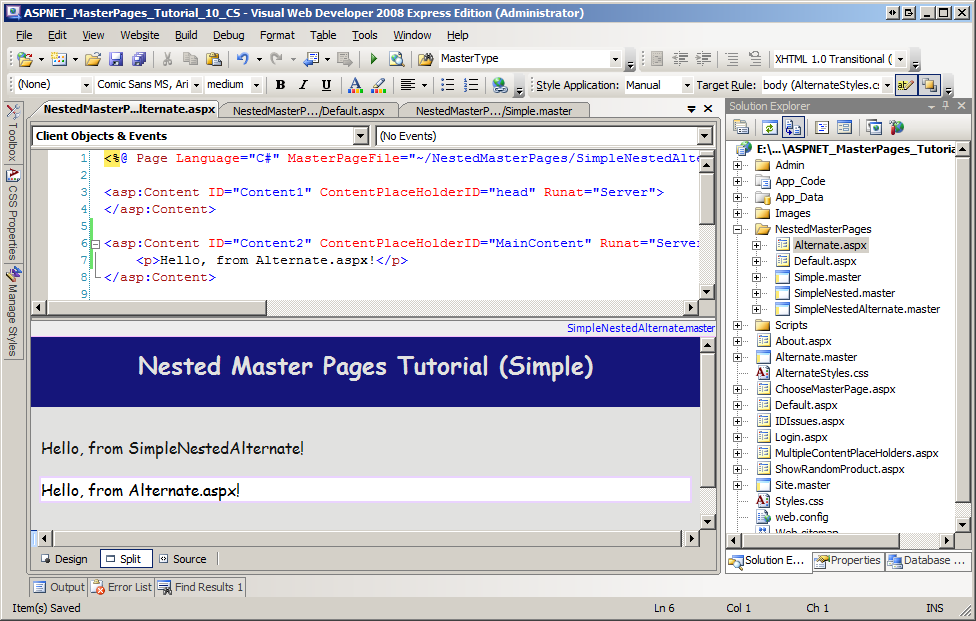 图 07:绑定到母版页(单击以查看全尺寸图像)SimpleNestedAlternate.master Alternate.aspx