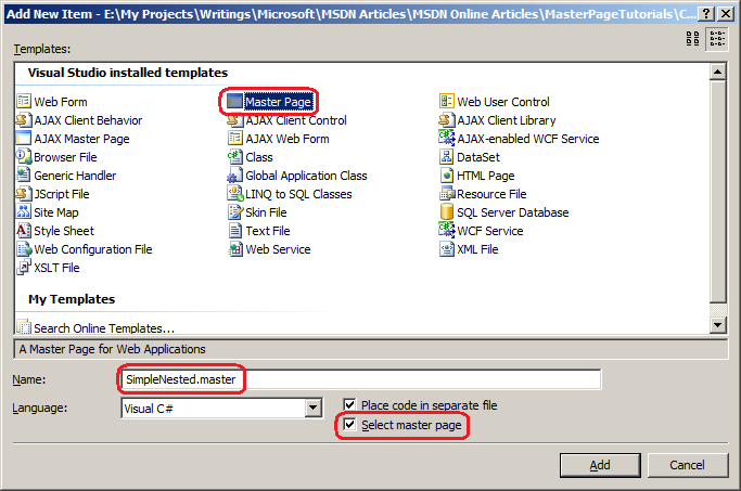 让我们向名为 <NestedMasterPages。 右键单击 NestedMasterPages 文件夹,然后选择“添加新项”。 此时会显示图 2 中显示的“添加新项”对话框。 选择母版页模板类型并键入新母版页的名称。 若要指示新母版页应为嵌套母版页,请选中“选择母版页”复选框。