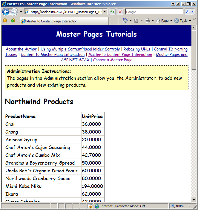 ~/Admin具有某些期望。 对于初学者,他们希望存在某些 ContentPlaceHolder 控件。 此外,~/Admin/AddProduct.aspx和~/Admin/Products.aspx页面调用母版页的公共RefreshRecentProductsGrid方法、设置其GridMessageText属性或为其PricesDoubled事件具有事件处理程序。 因此,嵌套母版页必须提供相同的 ContentPlaceHolders 和公共成员。 - 在前面的教程中,我们增强了