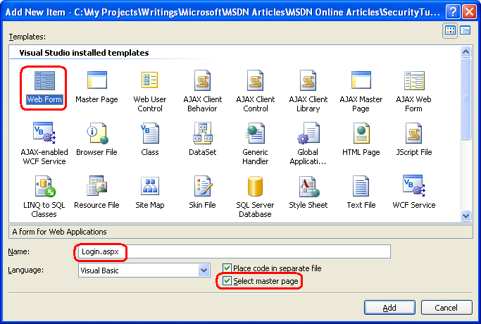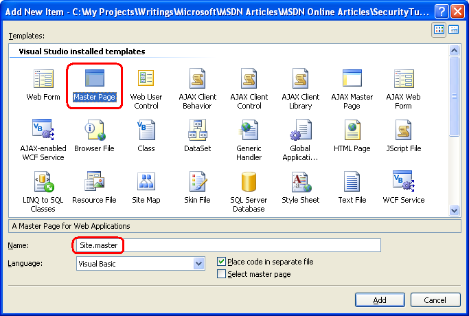 图 03:将名为 Site.master 的母版页添加到网站 (单击以查看全尺寸图像)