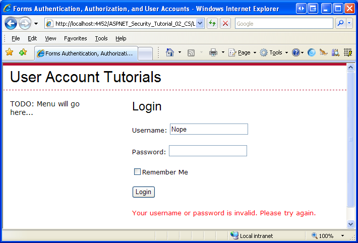 登录页面的责任是确定用户的凭据是否有效,如果是,则创建表单身份验证票证并将用户重定向回他们尝试访问的页面。 身份验证票证包含在对网站上的页面的后续请求中,FormsAuthenticationModule 使用这些请求来标识用户。