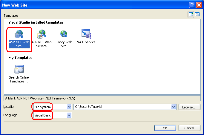 在配置表单身份验证之前,首先需要 ASP.NET 网站。 首先创建一个新的基于文件系统 ASP.NET 网站。 为此,请启动 Visual Web 开发人员,然后转到“文件”菜单并选择“新建网站”,显示“新建网站”对话框。 选择“ASP.NET 网站”模板,将“位置”下拉列表设置为“文件系统”,选择要放置网站的文件夹,并将语言设置为 VB。 这将创建一个包含 Default.aspx ASP.NET 页、App_Data文件夹和 Web.config 文件的新网站。