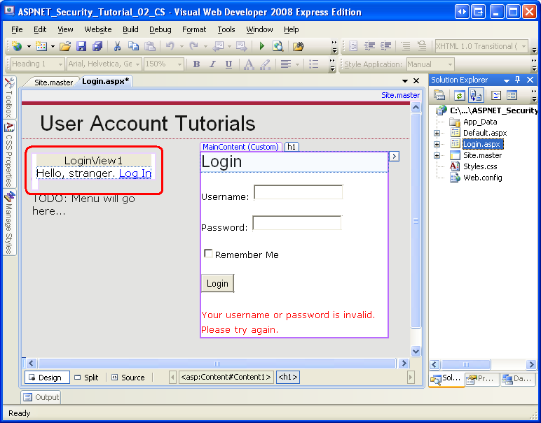 建议自定义 Logout.aspx 页,以隐藏母版页的 LoginContent ContentPlaceHolder (就像我们在步骤 4) 中对 Login.aspx 所做的那样。 原因是 LoginStatus 控件呈现的 Login LinkButton (Hello 下的登录,陌生人 ) 将用户发送到在 ReturnUrl 查询字符串参数中传递当前 URL 的登录页。 简言之,如果已注销的用户单击此 LoginStatus 的 Login LinkButton,然后登录,他们将被重定向回 Logout.aspx,这很容易使用户感到困惑。