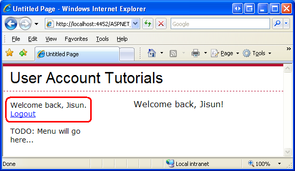 图 18:Default.aspx 显示欢迎返回、Jisun 以及注销 LinkButton (单击以查看全尺寸图像)
