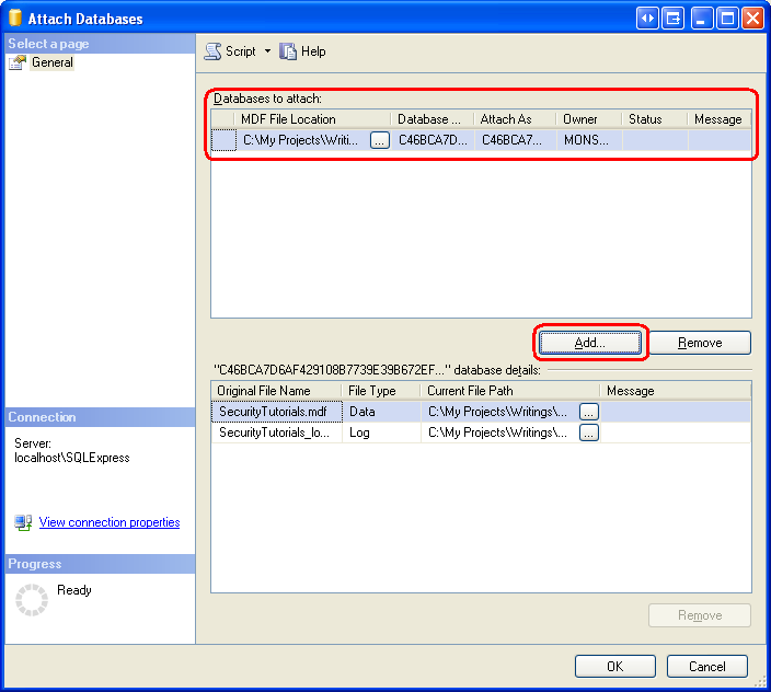 图 4:将 SecurityTutorials.mdf 数据库附加上(单击以查看全尺寸图像)