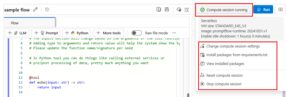 你需要一个计算会话来运行提示流。 使用 Microsoft Foundry 创建和管理提示流计算会话。