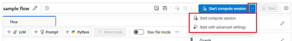 在提示流的顶部工具栏中,选择“启动计算会话”按钮右侧的下拉箭头。 选择“使用高级设置启动”以自定义计算会话。