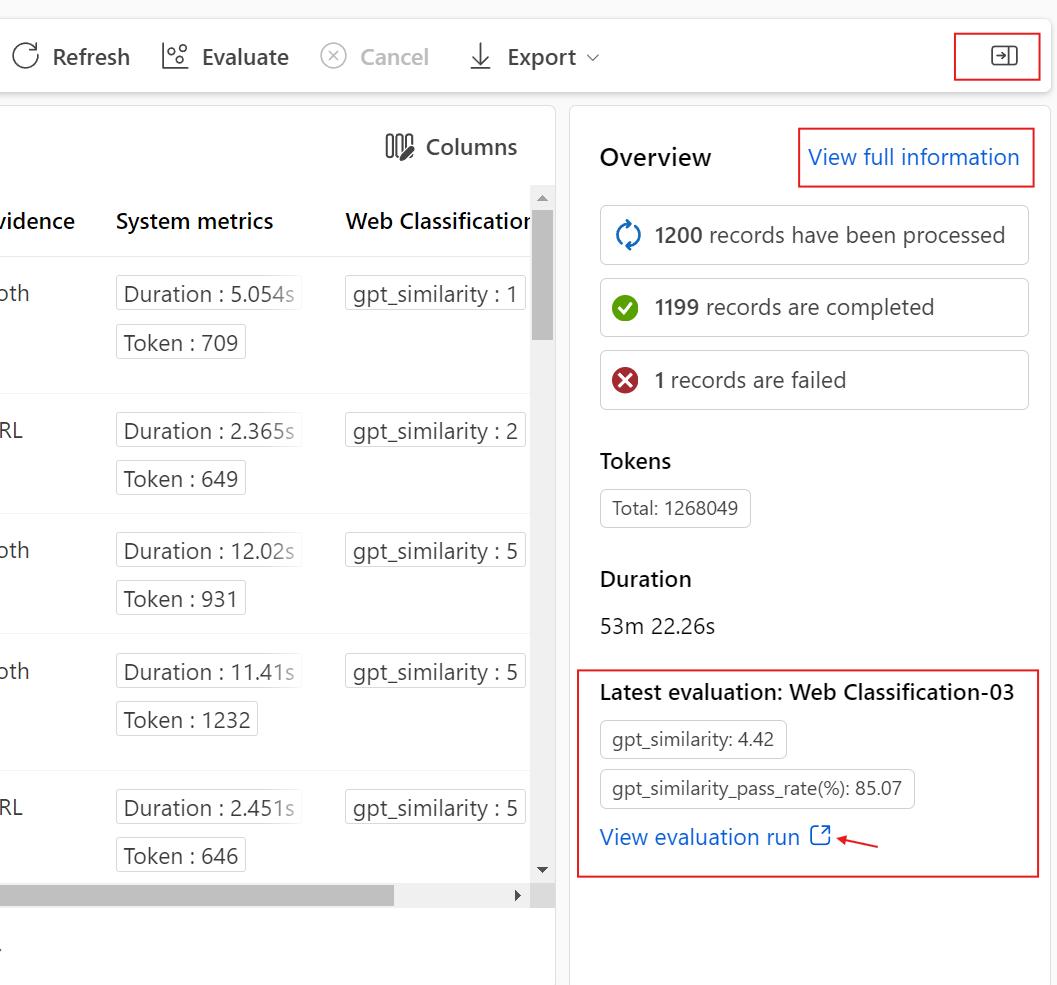 默认情况下,此处显示了最新的评估运行聚合指标,可以选择“查看评估运行”以跳转到查看评估运行本身。