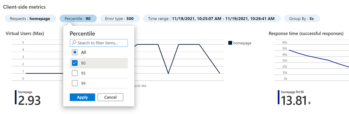 (可选)更改显示筛选器以查看特定时间范围、结果百分位数或错误类型。