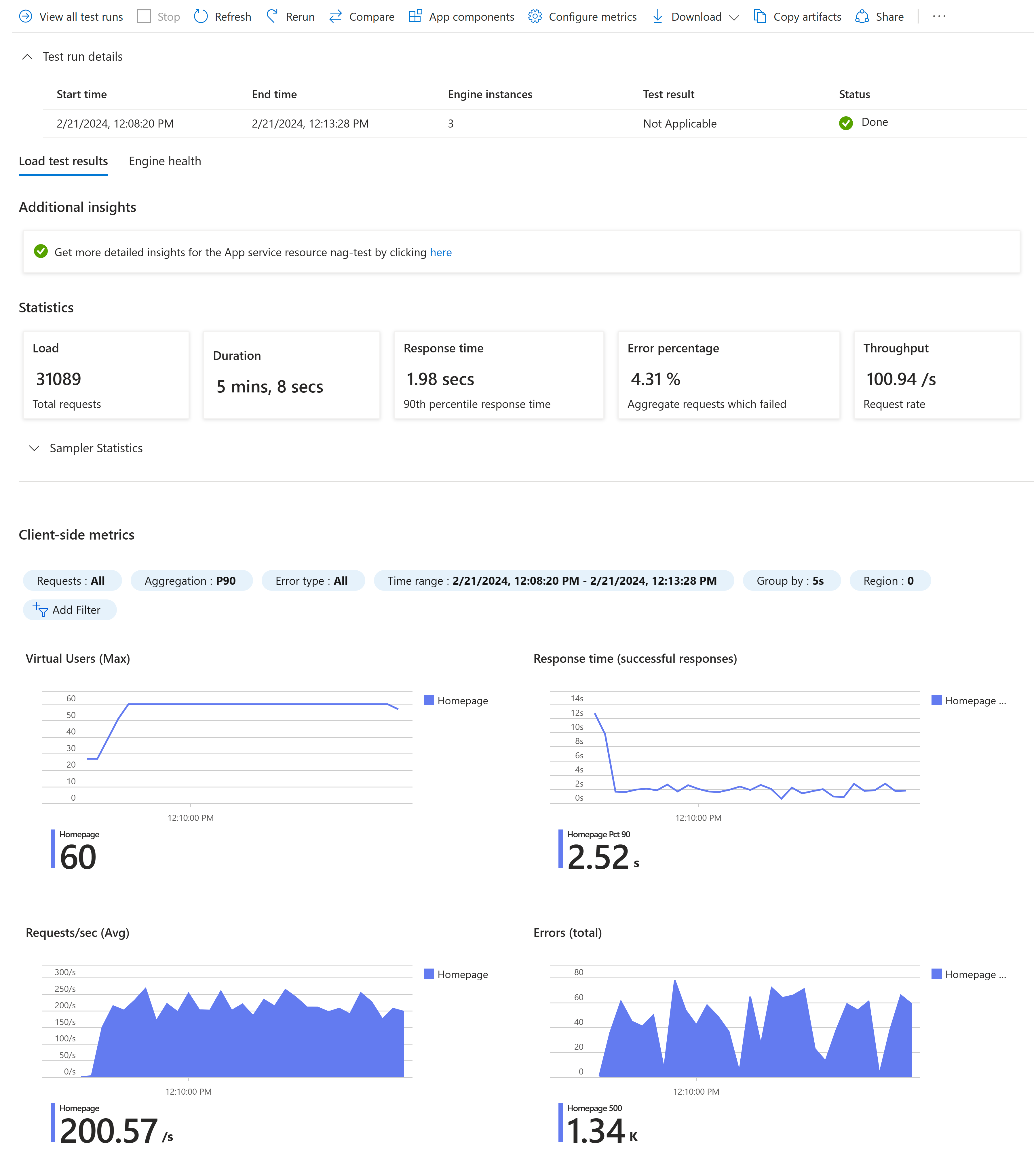 请注意 Azure 门户中的测试运行详细信息、统计信息和客户端指标。
