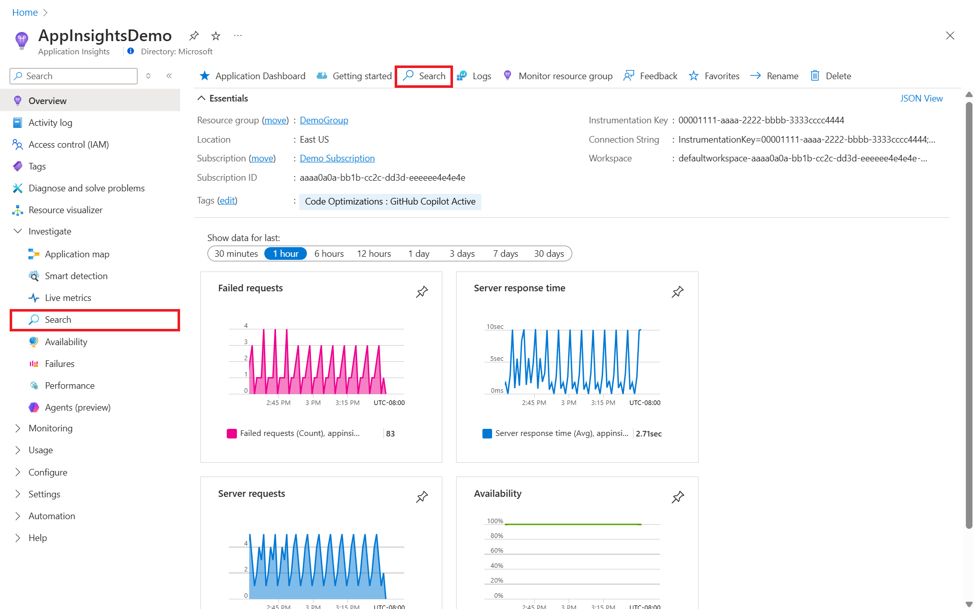 - 详细了解如何使用 可用性视图 设置定期测试,以监视应用程序的可用性和响应能力。