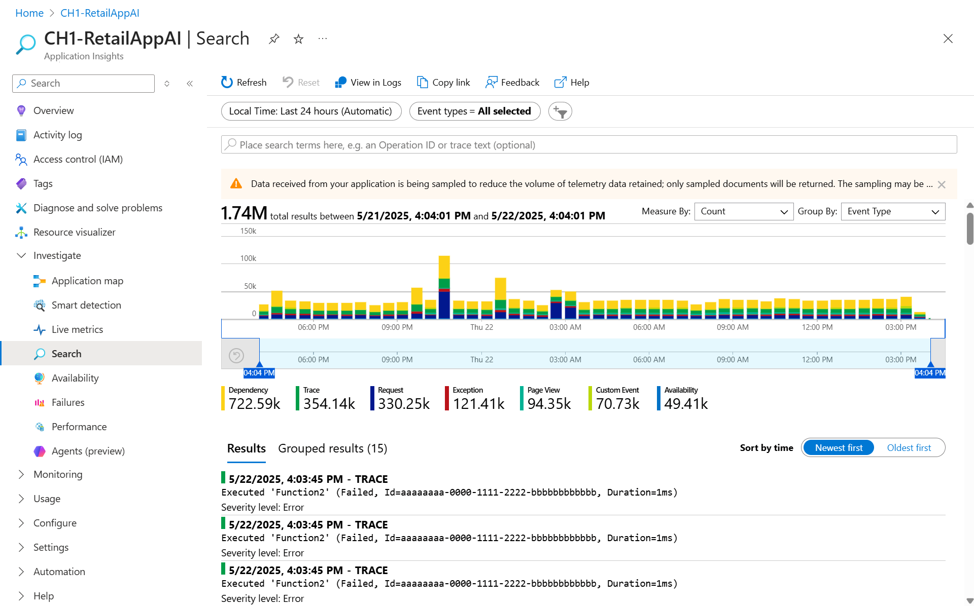 搜索视图 - 允许用户查找和检查各个遥测项,例如页面视图、异常和自定义事件。
