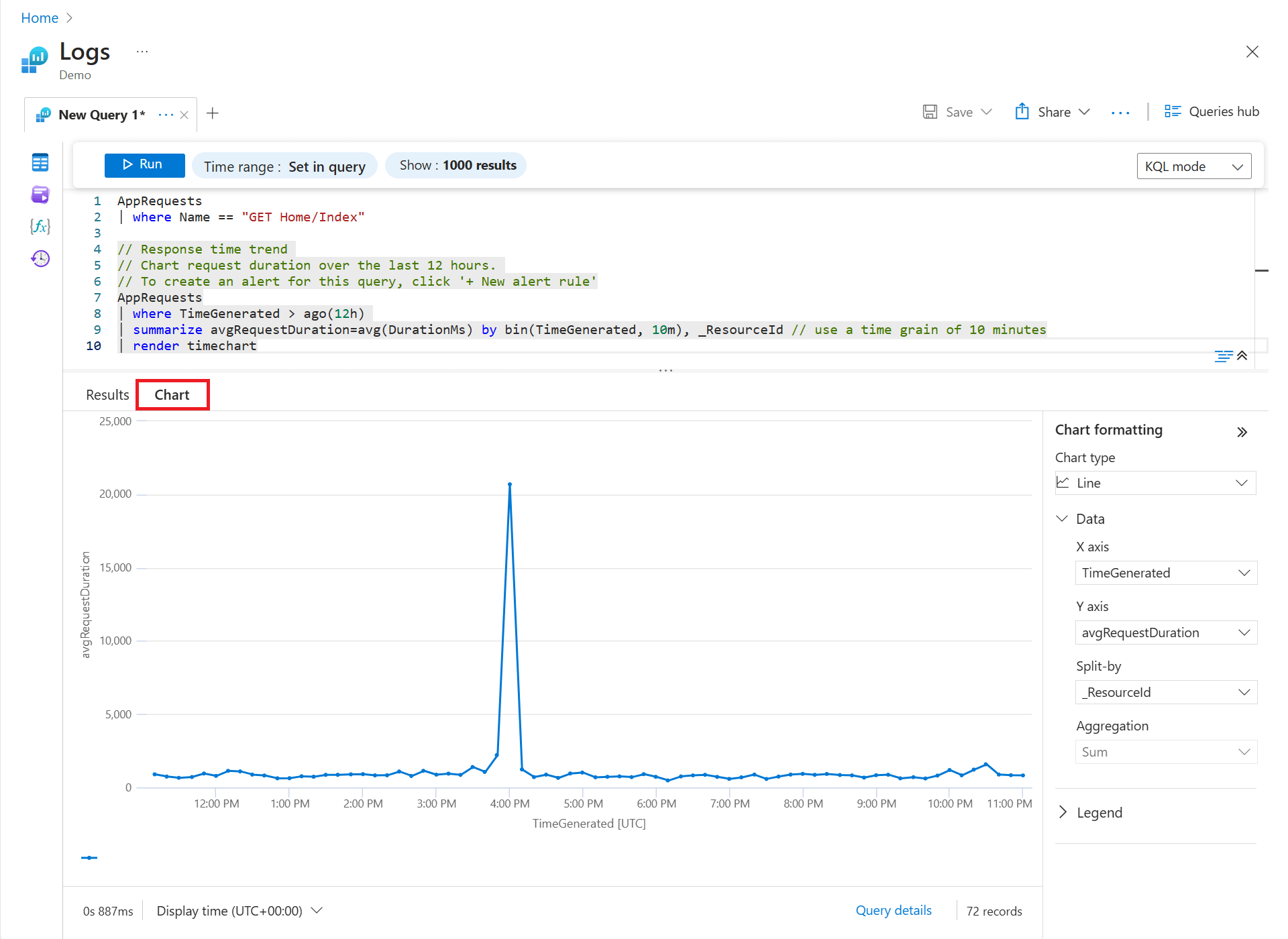 可以在“日志”体验的左上角,在活动查询选项卡的名称下方查看查询的范围。如果使用自己的环境,则会看到一个用于选择其他范围的选项。 但在演示环境中不提供此选项。